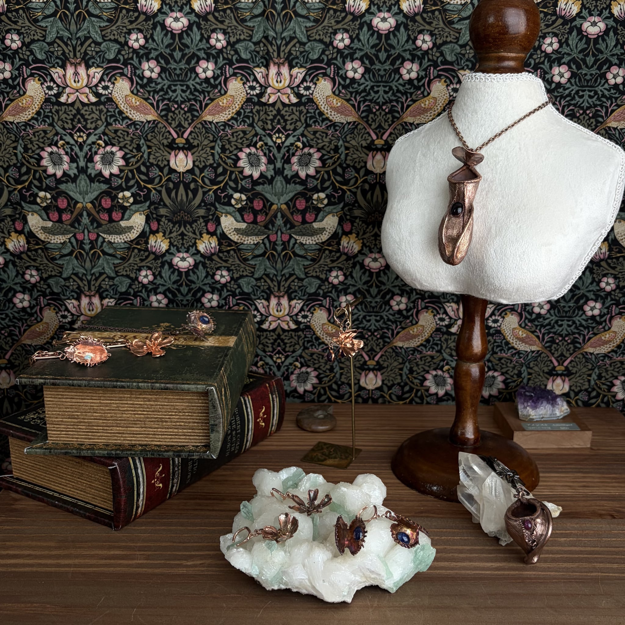 収穫した花をエレクトロフォーミングという技法で銅めっきし、アクセサリーに仕立てているため、銅の中には本物のハエトリグサの花が入っています。