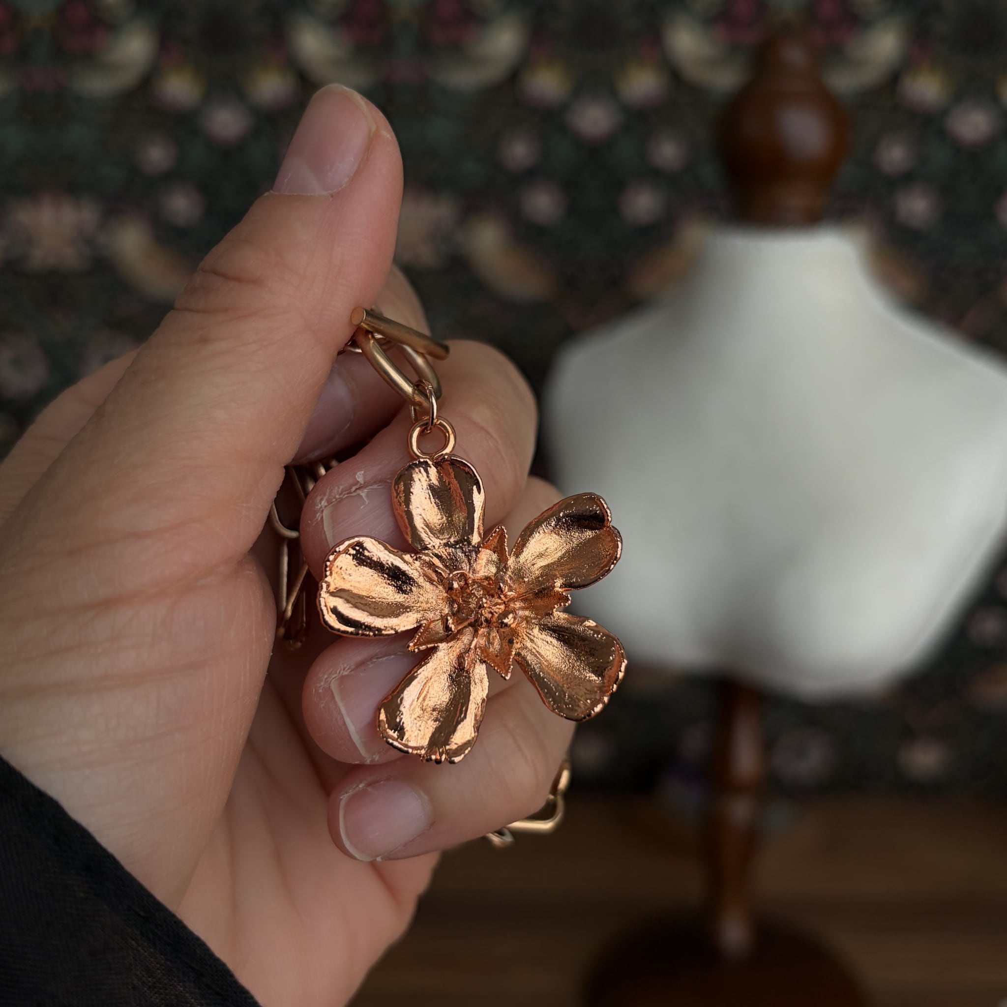 この大切な花の形を、変色を気にせず作品にすることができるエレクトロフォーミングは、まさに作者が求めていた技法でした。