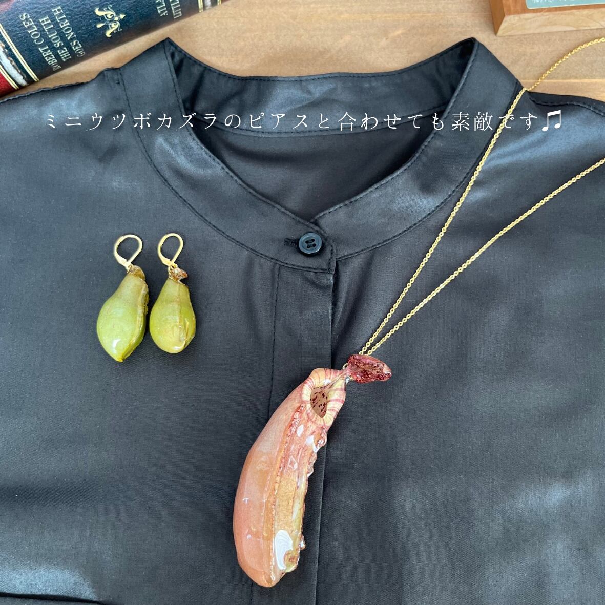 その甲斐あって、これまでのTorigusaのウツボカズラシリーズの中でも異彩を放つ、スレンダーでどことなく都会的な印象を受けるウツボカズラネックレスとなりました!