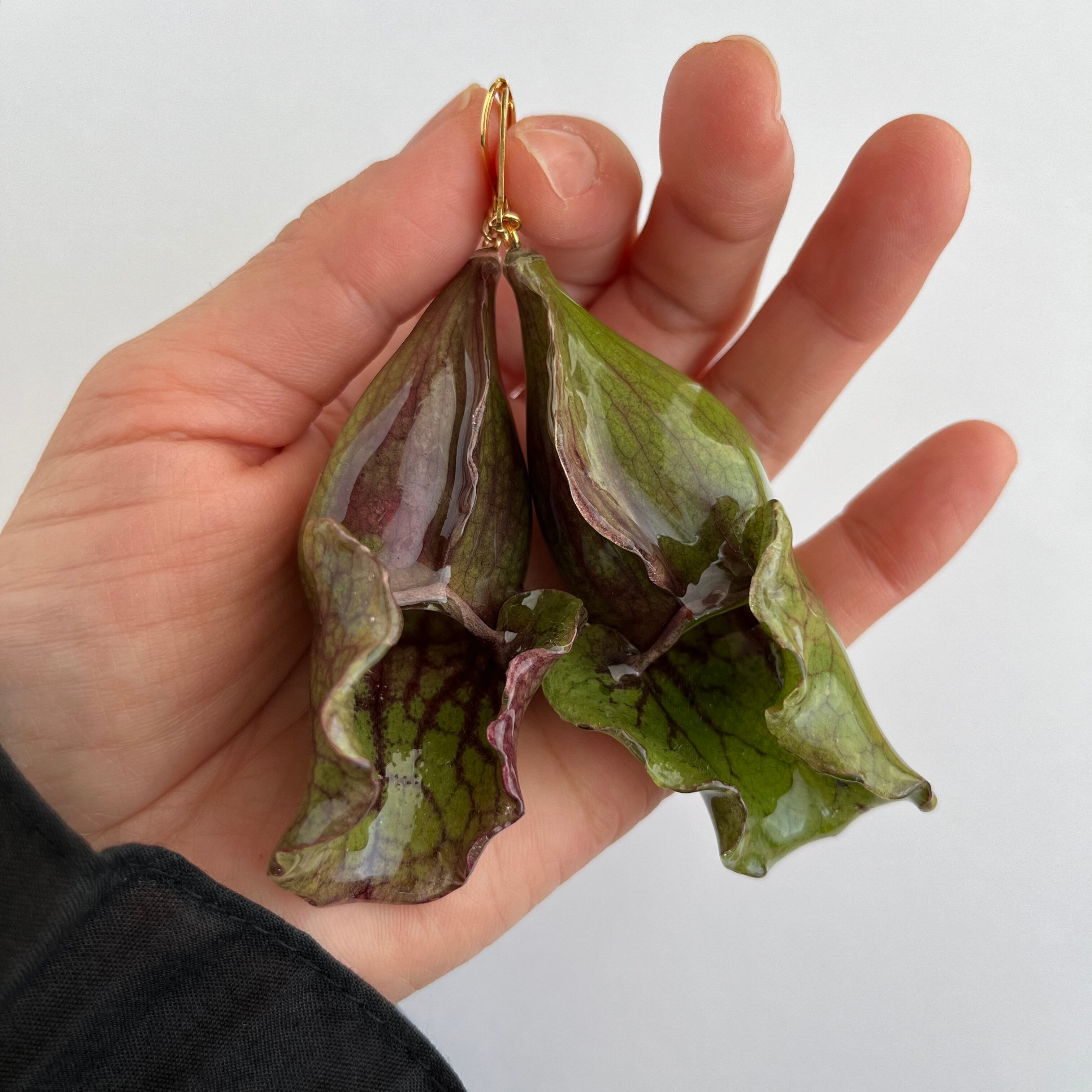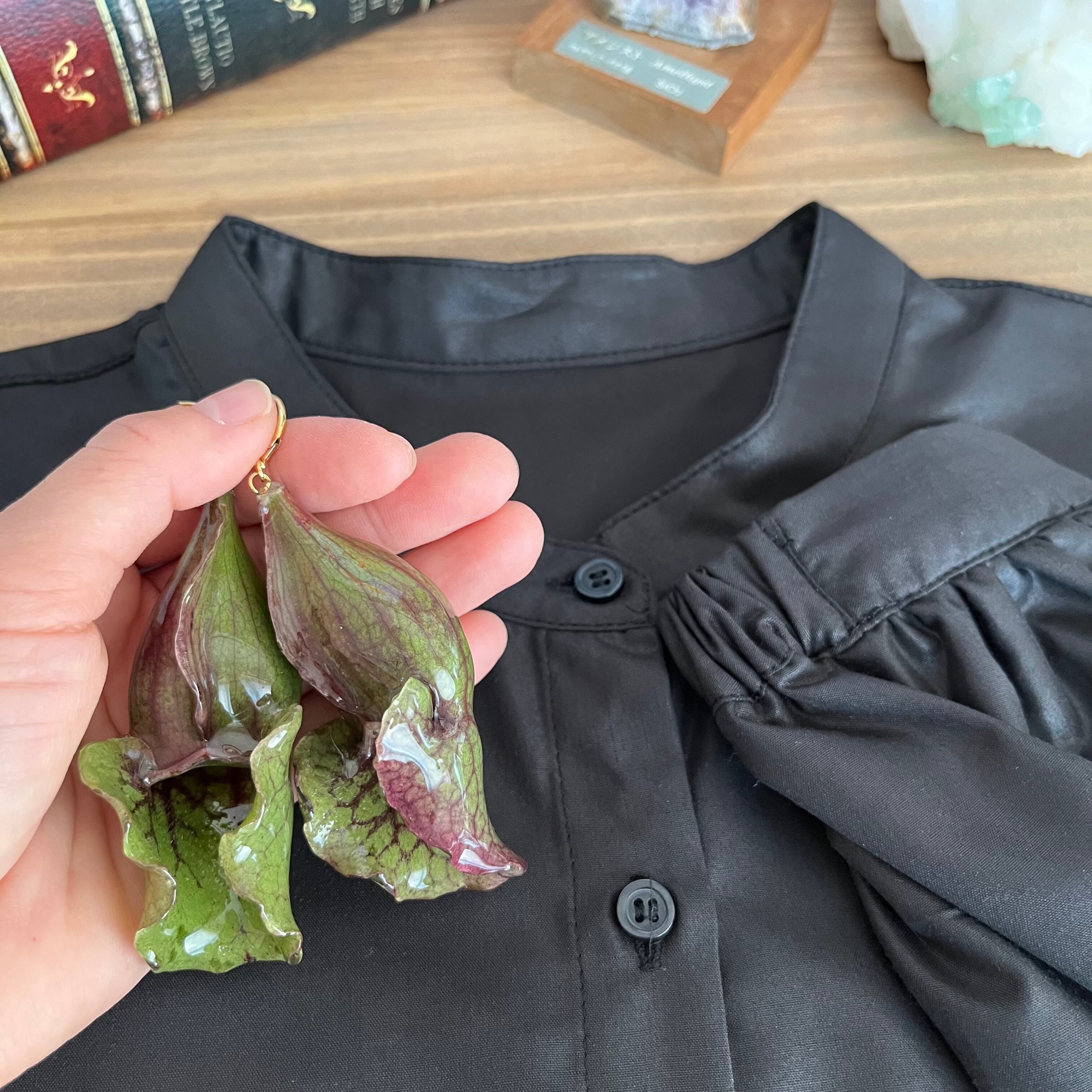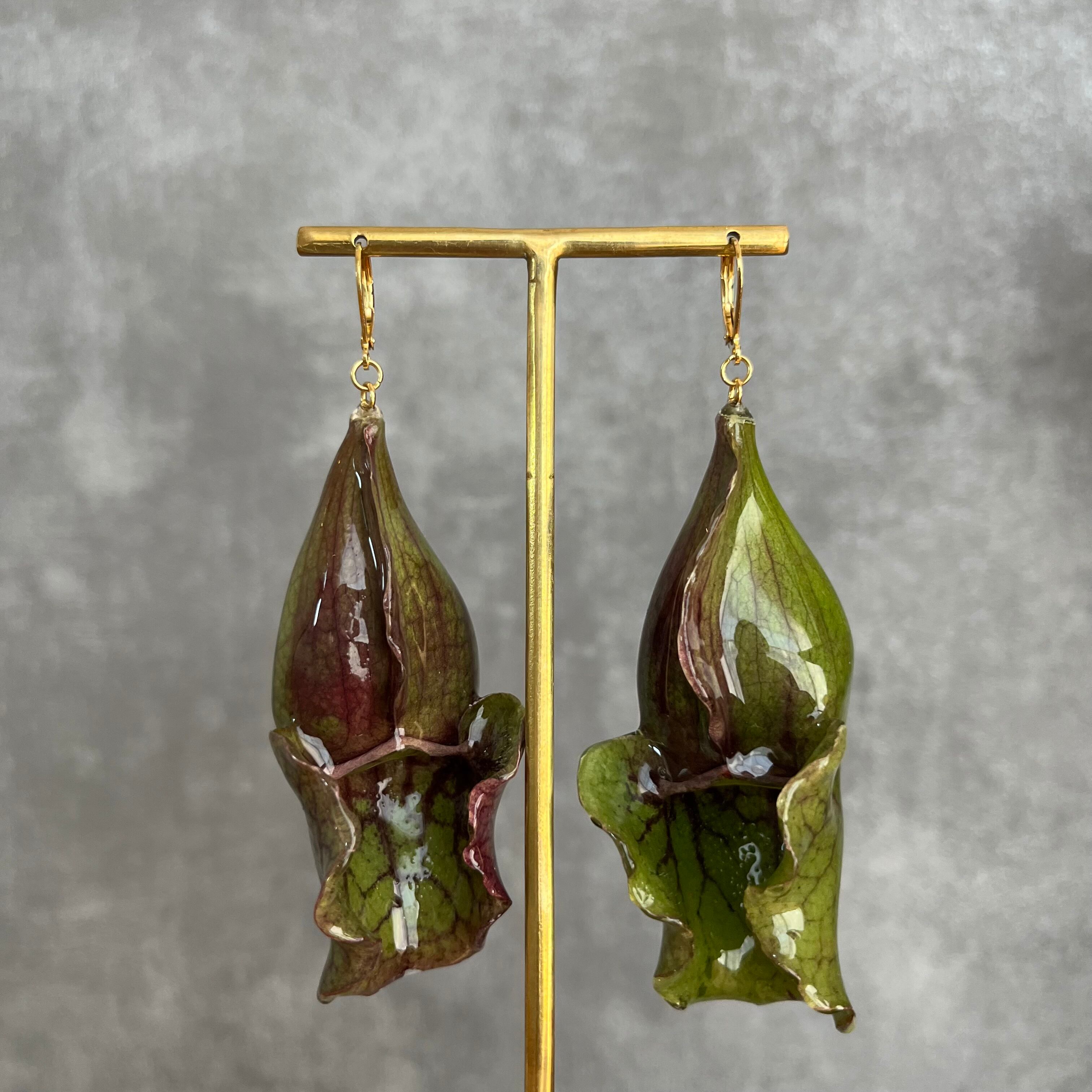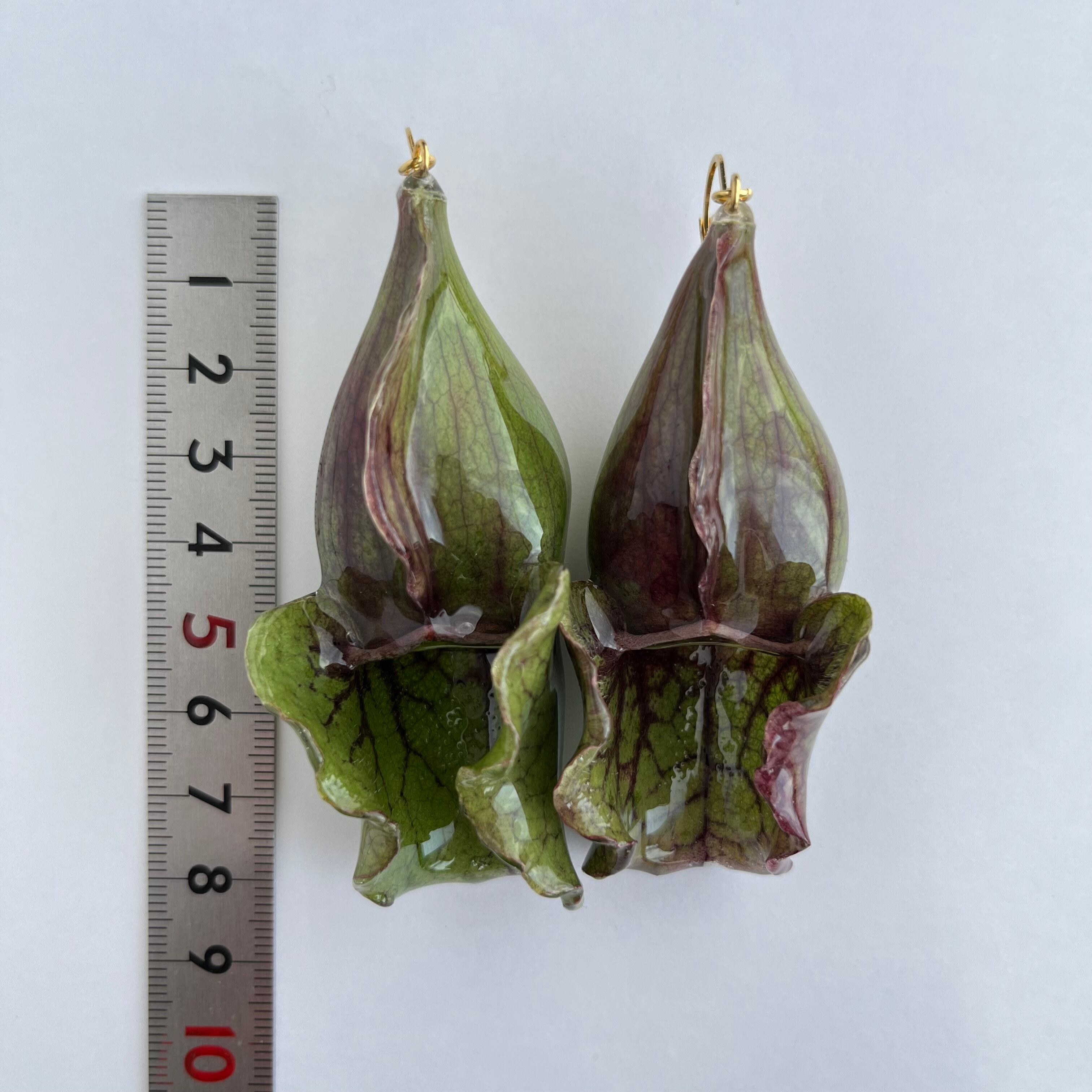 ボリューム満点なサラセニア・プルプレア「ベノーサ」の捕虫葉で制作したピアスです。